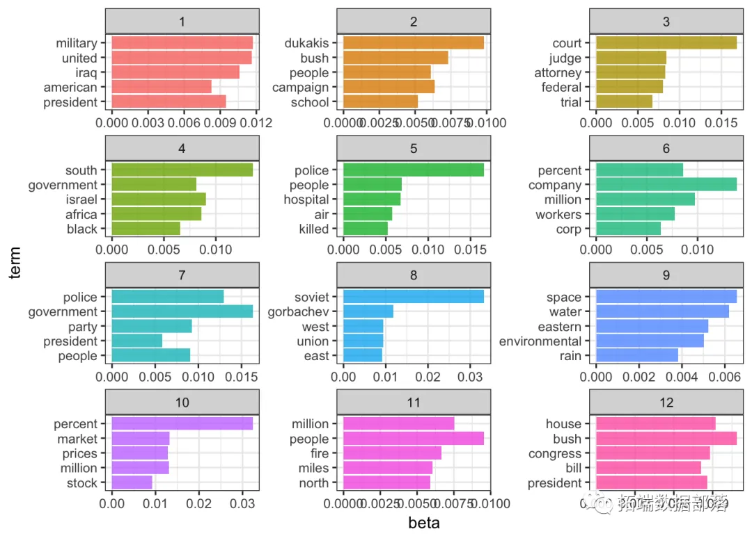 group_by(topic) %>% top_n(5, beta) %>% ungroup() %>% arrange(topic, -beta) top_terms ## # A tibble: 60 × 3 ## topic term beta ## <int> <chr> <dbl> ## 1 1 military 0.011691176 ## 2 1 united 0.011598436 ## 3 1 iraq 0.010618221 ## 4 1 president 0.009498227 ## 5 1 american 0.008253379 ## 6 2 dukakis 0.009819260 ## 7 2 bush 0.007300830 ## 8 2 campaign 0.006366915 ## 9 2 people 0.006098596 ## 10 2 school 0.005208529 ## # ... with 50 more rows