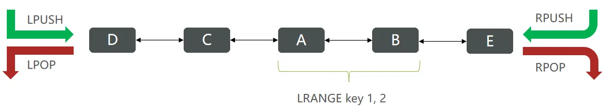- LRANGE key star end:返回一段角标范围内的所有元素