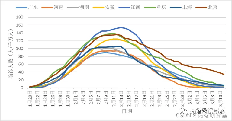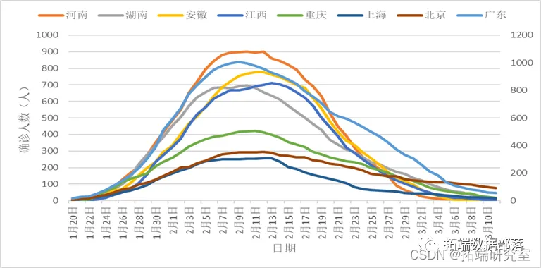 选择人口流动较大的北京、上海、广东,以及与武汉相邻的重庆、湖南、江西、安徽、河南,一共八个省级行政区的确诊人数变化数据(查看文末了解数据免费获取方式)作为样本。