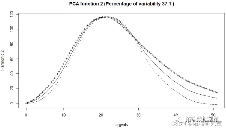 以上分别为函数型数据的均值,方差,协方差以及相位图。(其中粗线部分是由均值绘制的相位图。)疫情的发展可以看作一个由平稳态逐渐发展为不平稳态,最后再回到平稳态的过程。相位图中,我们通常把加速度称为势能,而把速度称为动能。在第一象限阶段,病毒的传播自身的传播力度为主要势能,人们的防疫措施尚未建立完全,因此势能为正,不断转化为动能;在第12天左右的位置,势能由正变成负,函数的凹凸性发生了变化,也就是说人们的防疫管控力度已经成为了主要势能,疫情的传播达到了拐点,增长速度得到了控制;在第22天左右的位置,动能由正变成负,函数的单调性发生了变化,疫情的传播达到了极值点,感染人数从增长变为了减少;轨迹进入三四象限之后,疫情就逐渐缓解,当感染人数逐渐接近0的时候,减少的速度也会逐渐放缓,也就是加速度会回到一个较小的正值,最终当动能回到0时,也就意味着疫情的基本结束。