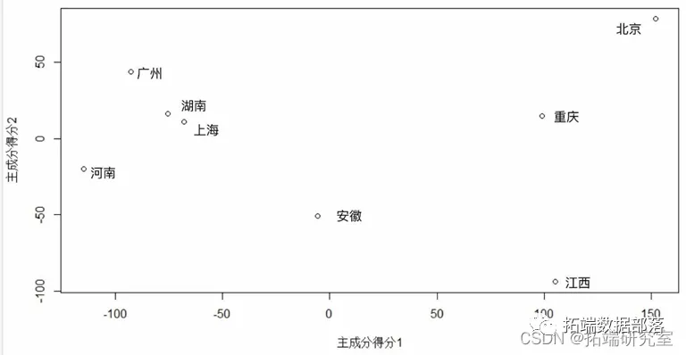 以上为前两个主成分,并可以绘制二维的主成分得分图。可以看到前两个主成分包含的数据信息已经超过了92%。