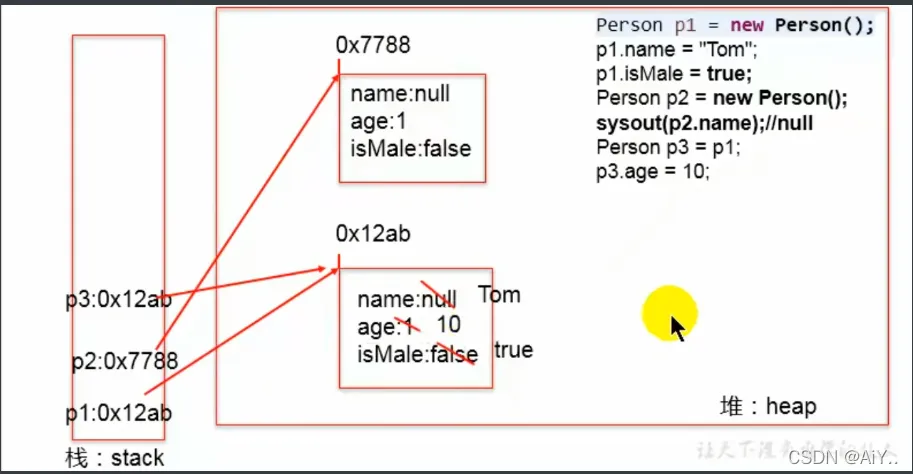 //将p1变量保存的对象地址赋给p3,导致p1和p3指向同一个对象实体Person p3=p1; System.out.println(p3.name); p3.age=10; System.out.println(p1.age);//10