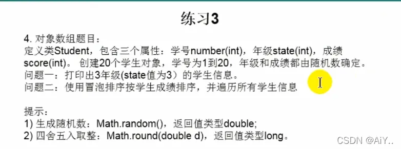 package Date0103.Practice4; public class StudentTest { public static void main(String[] args) { /** * 创建一个空的数组,数组类型是Student类型的。 * 里面可以放三个Student对象 * 简单的类型比如 int string * 但是Student 也是一种类型 * 里面可能包含 number、state、score等属性 */ Student[] student=new Student[20]; //对象数组,设置20个student的类; for(int i=0; i<student.length;i++){ //给数组元素赋值 student[i]=new Student(); //给student对象的属性赋值 student[i].number=i+1; student[i].state=(int)(Math.random()*(6-1+1)+1);//年级:[1,6] student[i].score=(int)(Math.random()*(100-0+1));//成绩:[0,100] } //遍历学生数组 for(int j=0;j<student.length;j++){ // System.out.println(student[j].number+","+student[j].state+","+student[j].score); System.out.println(student[j].info()); } System.out.println("********输出年级是3的学生**********"); for(int j=0;j<student.length;j++){ // System.out.println(student[j].number+","+student[j].state+","+student[j].score); if(student[j].state==3) System.out.println(student[j].info()); } System.out.println("********使用冒泡排序把学生成绩排序输出**********"); for(int j=0;j<student.length;j++){ for(int i=0;i<student.length-j-1;i++){ if(student[i].score>student[i+1].score){ Student temp=new Student(); temp=student[i]; student[i]=student[i+1]; student[i+1]=temp; } } } for(int j=0;j<student.length;j++){ System.out.println(student[j].info()); } } } class Student{ int number;//学号 int state;//年级 int score; //成绩 public String info(){ return "学号:"+number+","+"年级:"+state+","+"成绩:"+score; } }