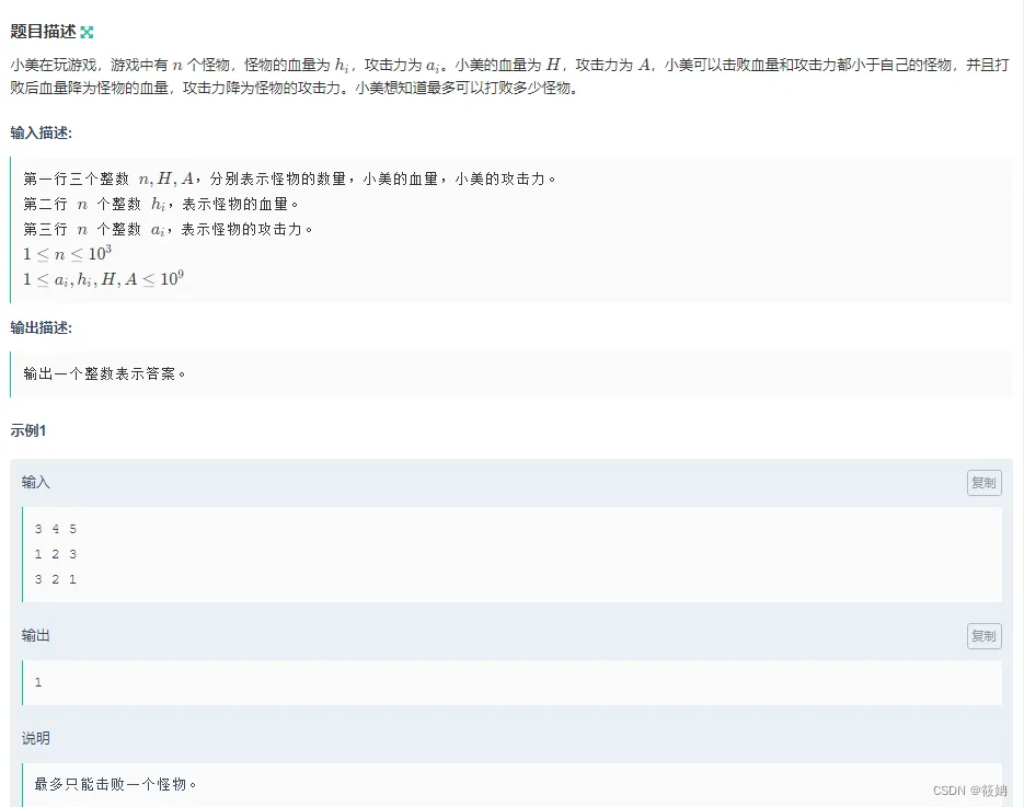 - 小美的血量(H)和攻击力(A)可以理解为背包的“容量”,每次击败一个怪物后,小美的血量和攻击力都会变成被击败怪物的血量和攻击力,这意味着每次决策都会影响后续决策的可行性和收益。