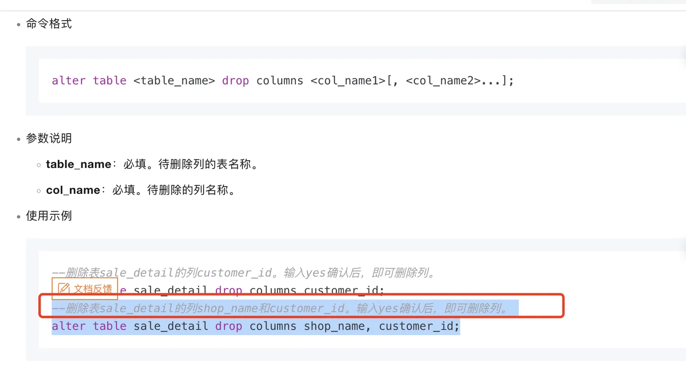 DataWorks官方文档中--删除表sale_detail的列shop_name和customer_id。输入yes确认后,即可删除列。