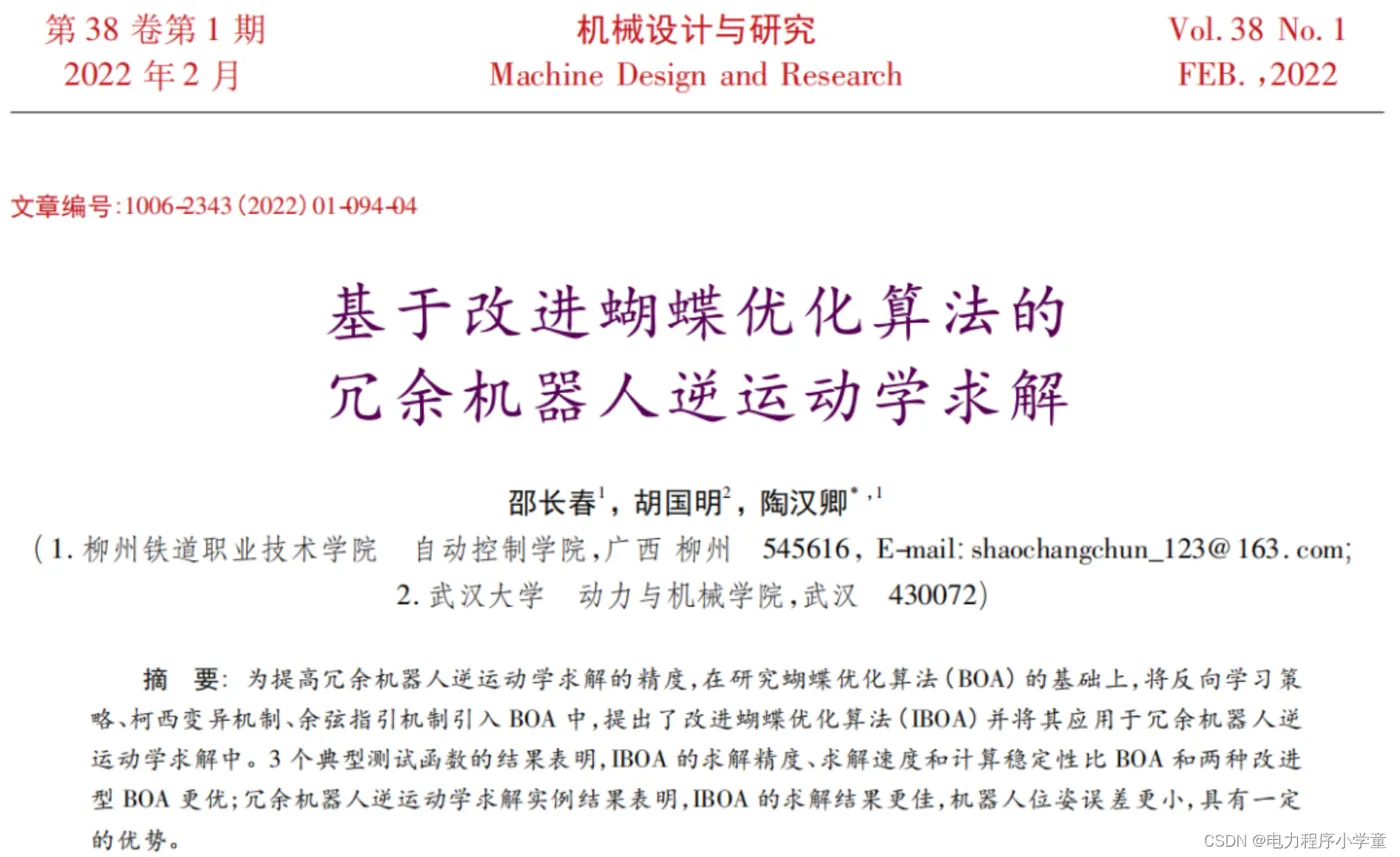 程序主要对蝴蝶算法(BOA)进行改进,参考文献《基于改进蝴蝶优化算法的冗余机器人逆运动学求解》,有如下改进策略:
