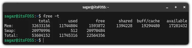 默认情况下,可用内存将显示物理内存和交换内存的行,但是如果你想获得它们的总和怎么办?