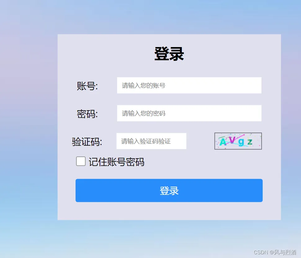 <div class="box_b"> <img src="./img/0775639c-c82c-4a29-937f-d2a3bae5151a.png" alt=""> <div class="register"> <h1>登录</h1> <div class="register_r"> <span>账号:</span> <input type="text" placeholder="请输入您的账号"> </div> <div class="register_r"> <span>密码:</span> <input type="password" placeholder="请输入您的密码" > </div> <div class="register_e"> <span>验证码:</span> <input type="text" placeholder="请输入验证码验证" id="verification"> <canvas id="c1" width="100" height="35" style="border:1px solid black"></canvas> </div> <div class="register_g"> <input type="checkbox"> <span>记住账号密码</span> </div> <button class="register_i">登录</button> </div> </div>