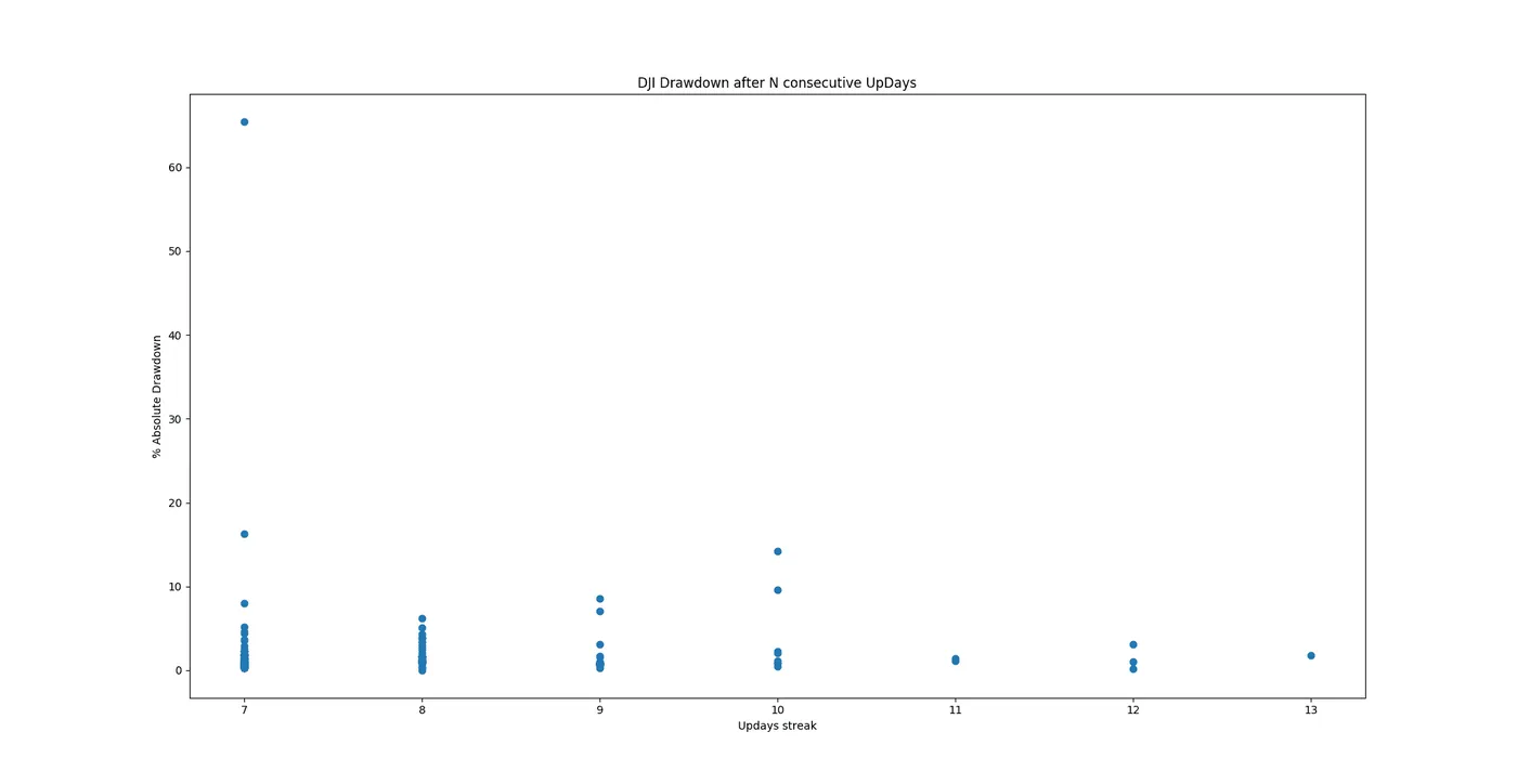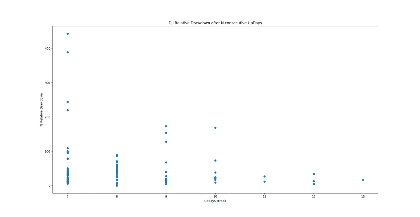 的确,因为1987和1929后来确实有非常大的熊市。但是并不是连涨结束后立即发生,如统计数据所示:相对回撤没有超过 100%,因此新高跟随了那些连涨结束后。