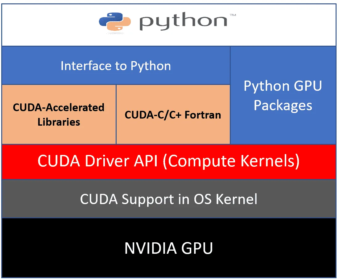 请注意,CUDA 在 Nvidia 的 GPU 上运行。它需要在操作系统内核中得到支持。最近,Windows 现在也得到了全面支持。然后,我们有 CUDA Driver API,它充当编程语言 API 和 CUDA 驱动程序之间的桥梁。在顶层,我们支持 C、C+和 Python。