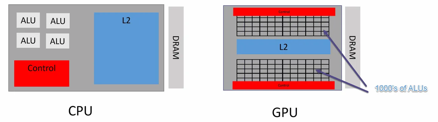 GPU 最初是为图形处理而设计的。它们被设计来满足处理典型计算机的多媒体数据的优化需求。为此,它们开发了一些特性,使它们与 CPU 有所不同。例如,它们有成千上万的核心,而 CPU 核心数量有限。它们的时钟速度比 CPU 慢得多。GPU 有自己的 DRAM。例如,Nvidia 的 RTX 2080 有 8GB 的 RAM。请注意,GPU 是专门的处理设备,没有通用处理单元的特性,包括中断或寻址设备的手段,例如键盘和鼠标。以下是 GPU 的架构: