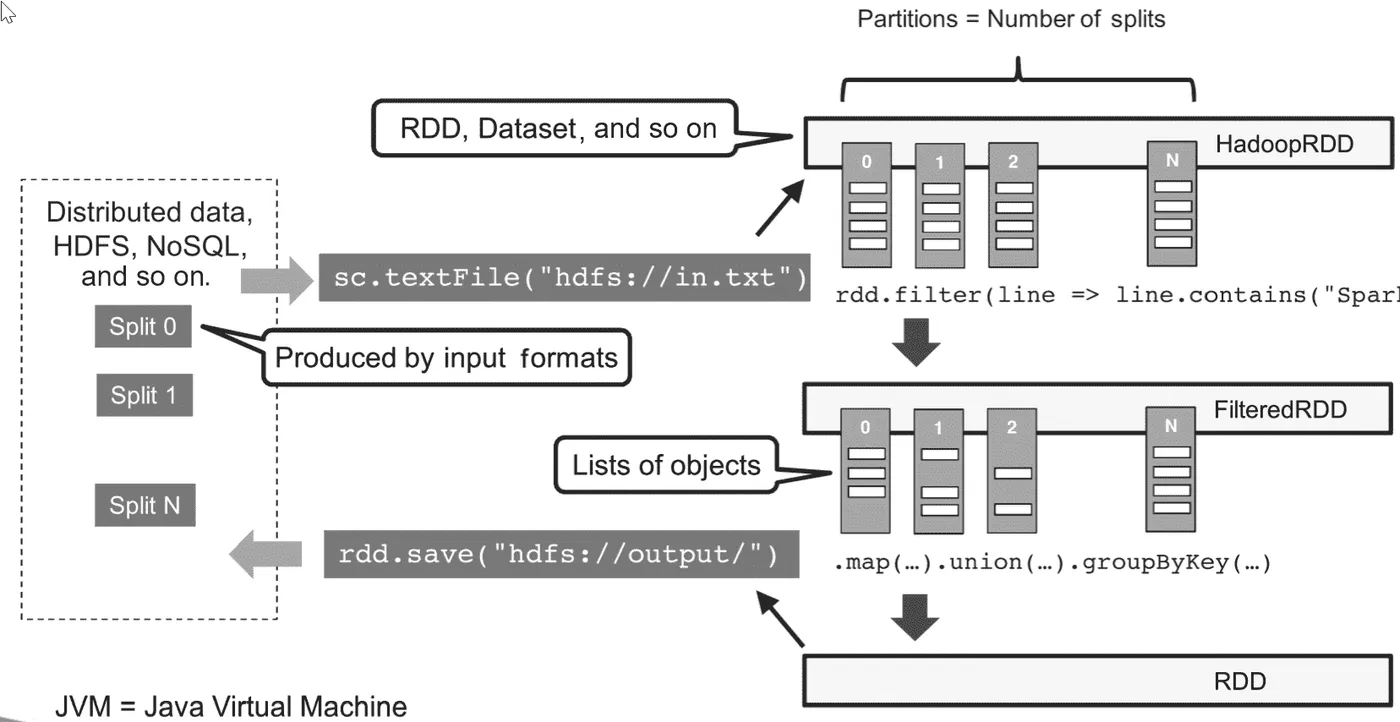 Apache Spark 是实现集群计算的最流行方式之一。在 Apache Spark 中,数据被转换为分布式容错数据集,称为Resilient Distributed Datasets(RDDs)。RDDs 是 Apache Spark 的核心抽象。它们是不可变的元素集合,可以并行操作。它们被分割成分区,并分布在节点之间,如下所示: