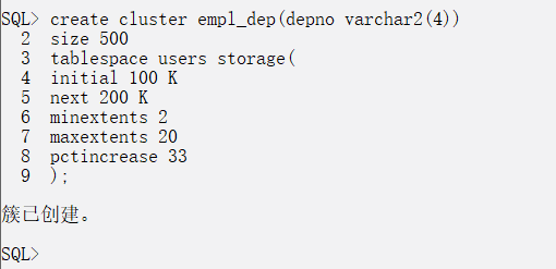 create cluster empl_dep(depno varchar2(4)) size 500 tablespace users storage( initial 100 K next 200 K minextents 2 maxextents 20 pctincrease 33 );