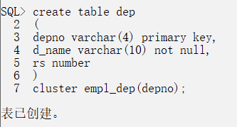 create table dep ( depno varchar(4) primary key, d_name varchar(10) not null, rs number ) cluster empl_dep(depno);