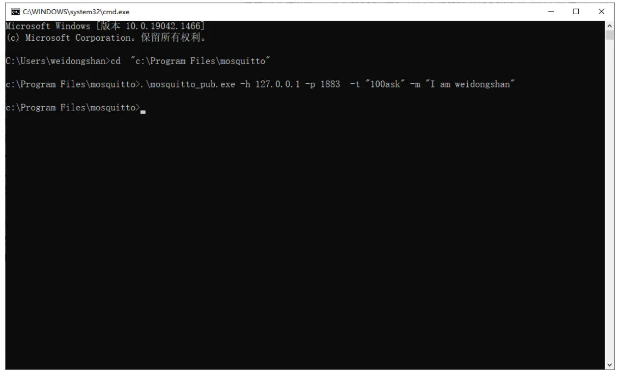 1. cd "c:\Program Files\mosquitto" 2. .\mosquitto_pub.exe -h 127.0.0.1 -p 1883 -t "100ask"