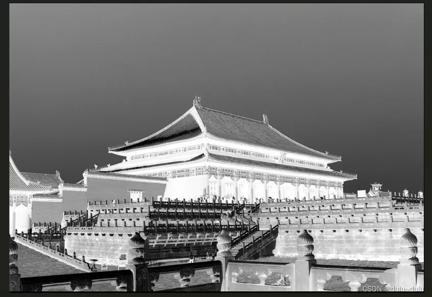 此时,图像从彩色变为带有灰度的黑白色。转换后,图像的ndarray 类型变为二维数据,每个像素点色彩只由一个整数表示。