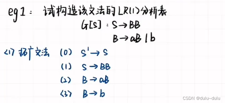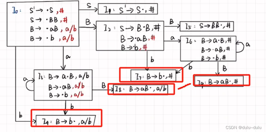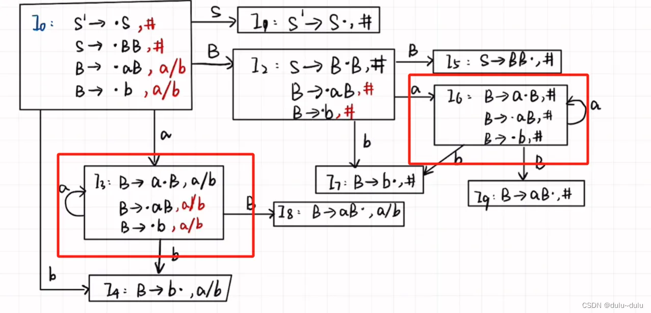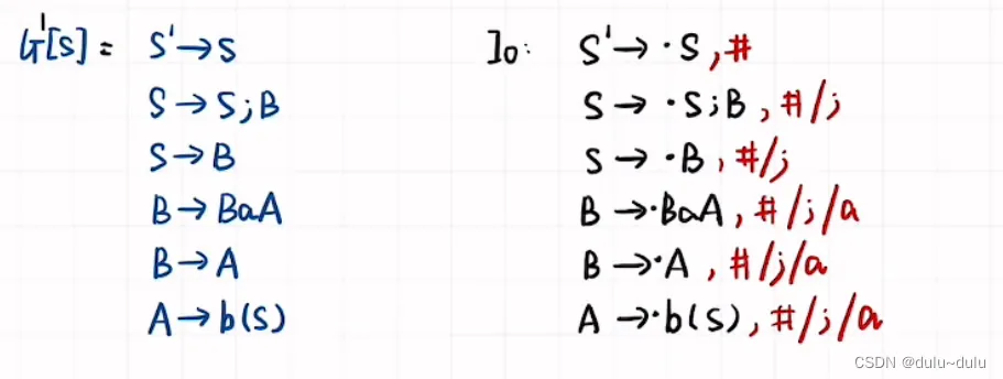 这里注意,若左边为S,那么找右边“圆点”后跟S的,有两种情况:①S-->S;B ②S’-->S