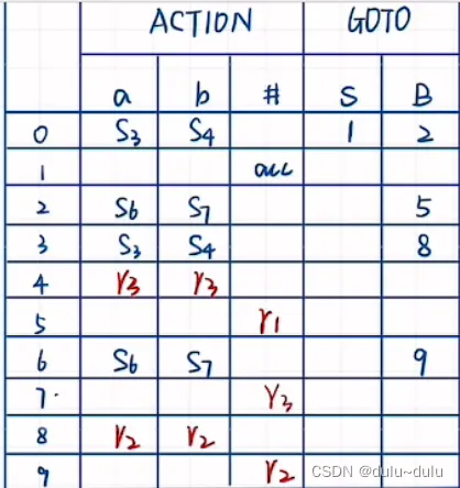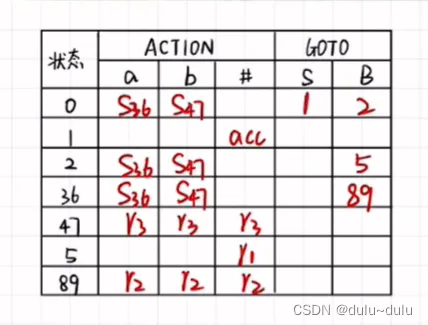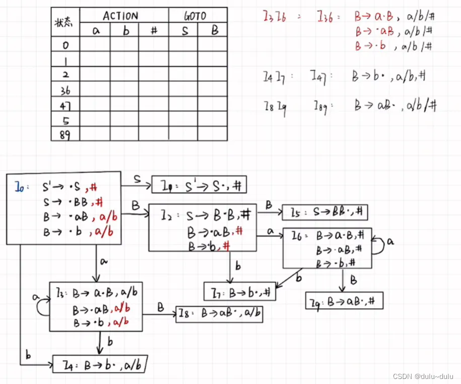 这里与LR(1)分析表唯一不同的是项目集规范族的处理,加入了合并同心集的概念(表达式相同,向前搜索符不同)