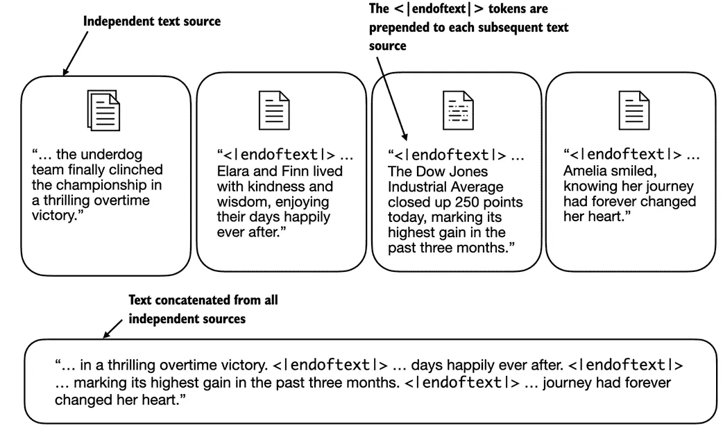 图 2.10 当处理多个独立的文本源时,我们在这些文本之间添加<|endoftext|>