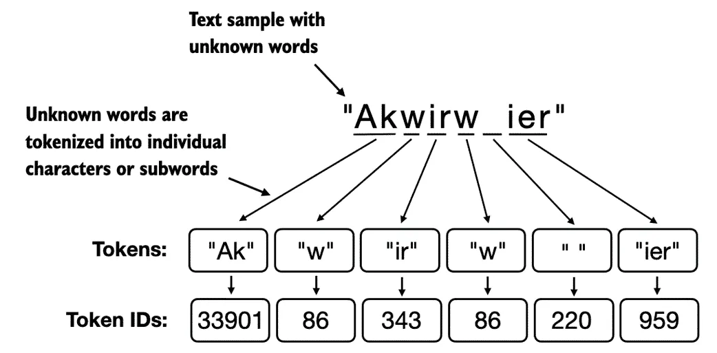 如图 2.11 所示,将未知单词分解为单个字符的能力确保了分词器以及随之训练的 LLM 可以处理任何文本,即使其中包含了其训练数据中未出现的单词。
