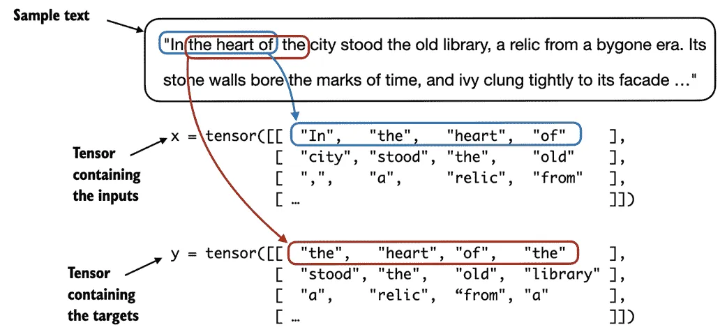 在此部分中,我们实现了一个数据加载器,使用滑动窗口方法从训练数据集中提取图 2.12 中所示的输入-目标对。