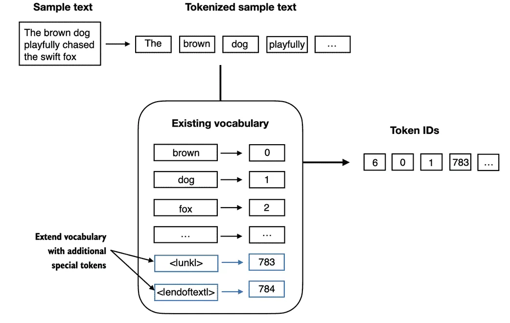具体来说,我们将修改上一节中实现的词汇表和标记器 SimpleTokenizerV2,以支持两个新的标记<|unk|>