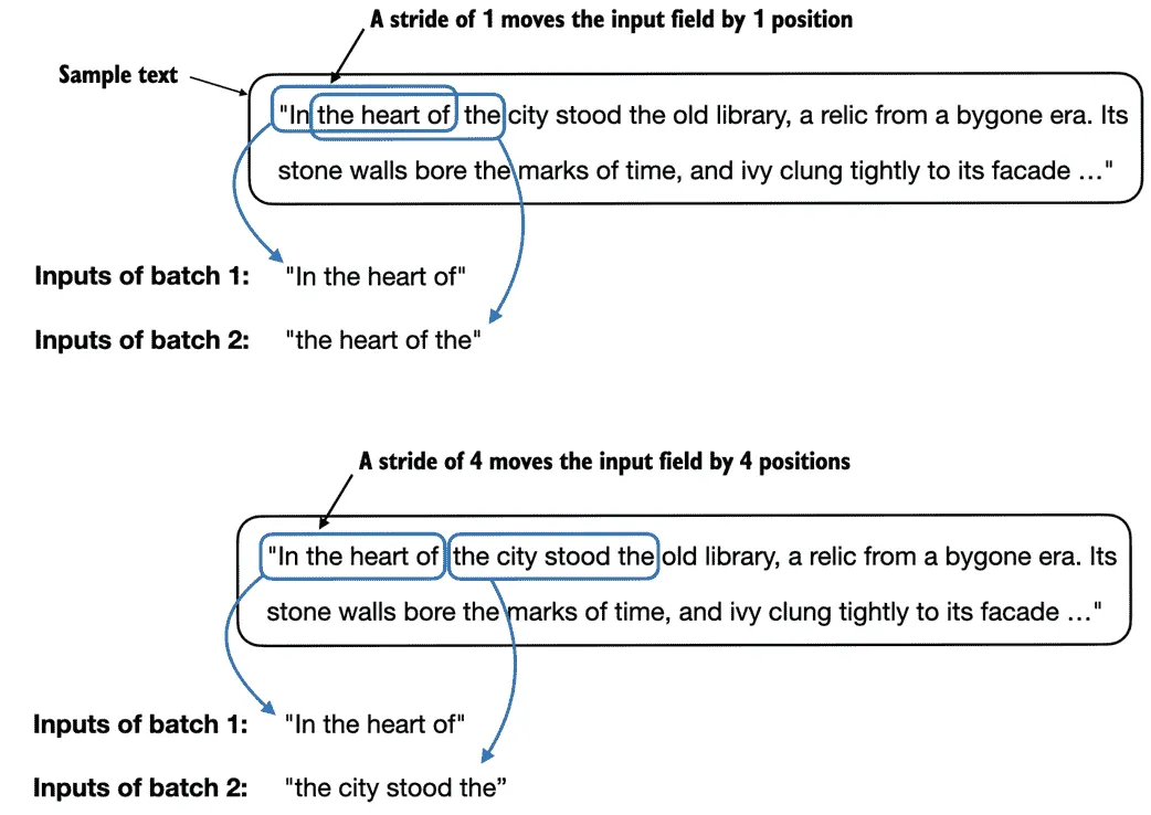 图 2.14 在从输入数据集创建多个批次时,我们在文本上滑动一个输入窗口。如果将步幅设置为 1,则在创建下一个批次时,将输入窗口向右移动 1 个位置。如果我们将步幅设置为等于输入窗口大小,我们可以防止批次之间的重叠。