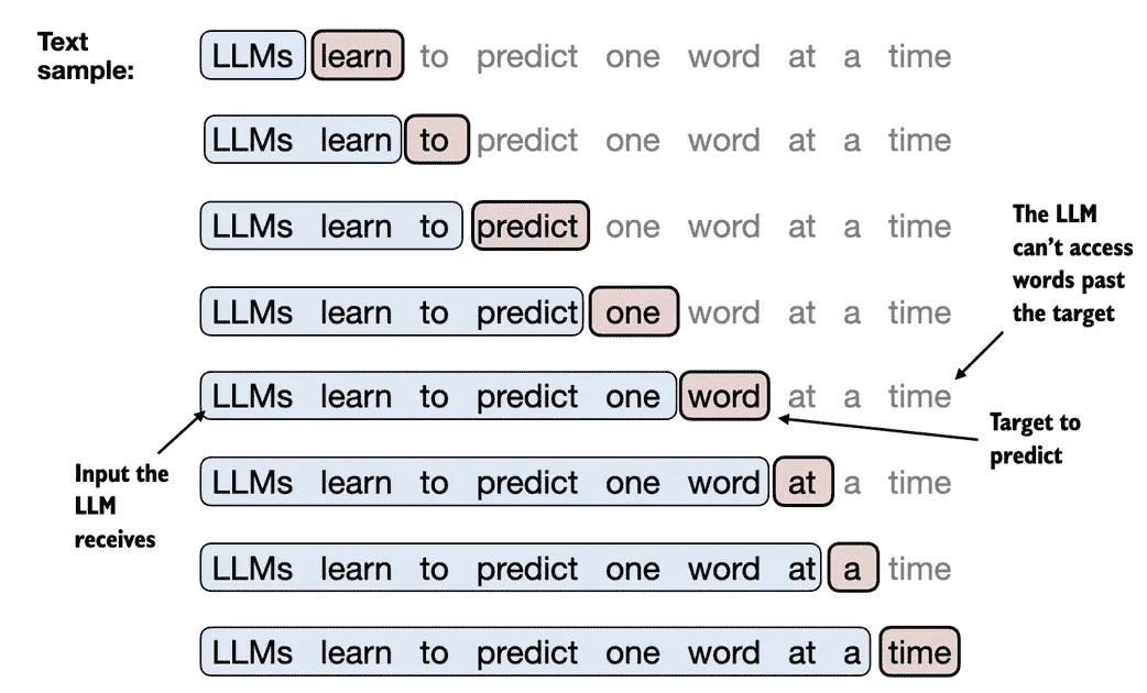 这些输入-目标对是什么样子?正如我们在第一章中学到的那样,LLMs 是通过预测文本中的下一个单词来进行预训练的,如图 2.12 所示。