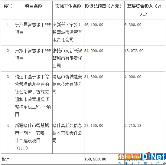 注:上述四个智慧城市项目预计应投入资金总额为158,550.00万元,本次拟计划投入的募集资金主要用于上述四个项目的建设投入,共26,086.08万元,其余部分以公司自有资金或通过SPV公司融资的方式投入。