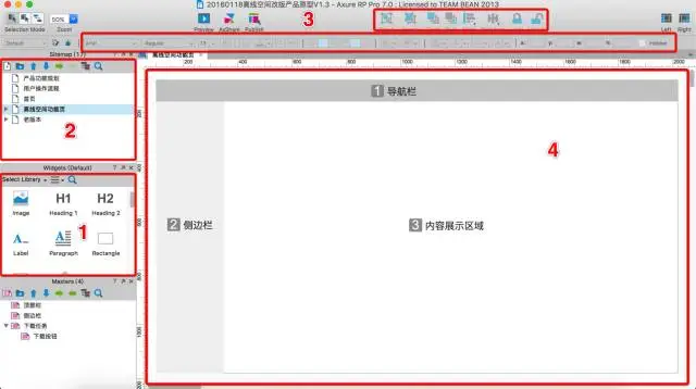 静态的产品原型设计上手非常简单,如上图所示,你用到的地方基本只有我用红框框标记出来的地方,连母板都用不到。一句话,你只要会把“1”里面的部件拖到“4”里面就算入门了哈哈。