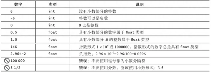 在Python程序中出现的6或0.355这样的数值,被称作数字常量。如果一个数字常量有小数点,则被称作浮点数,否则被称作整数。表2-1说明了如何在Python中写整数和浮点数常量。