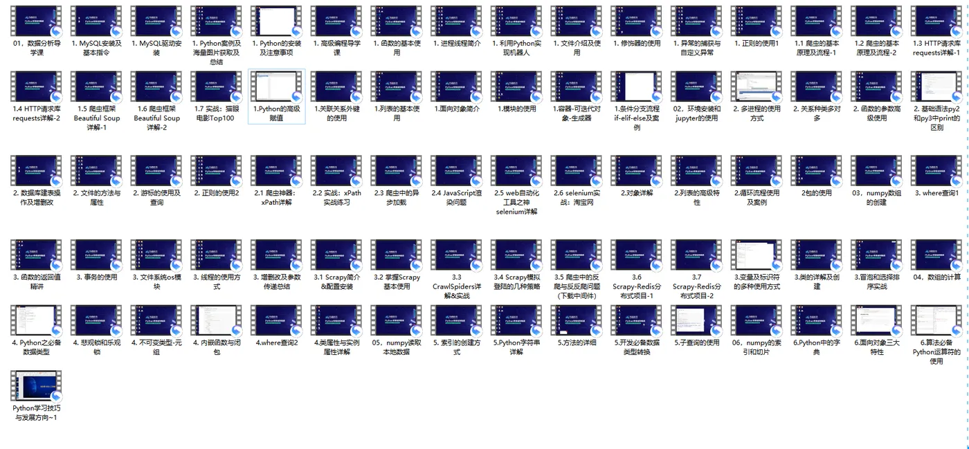 包含了Python入门、爬虫、数据分析和web开发的学习视频,总共100多个,虽然没有那么全面,但是对于入门来说是没问题的,学完这些之后,你可以按照我上面的学习路线去网上找其他的知识资源进行进阶。