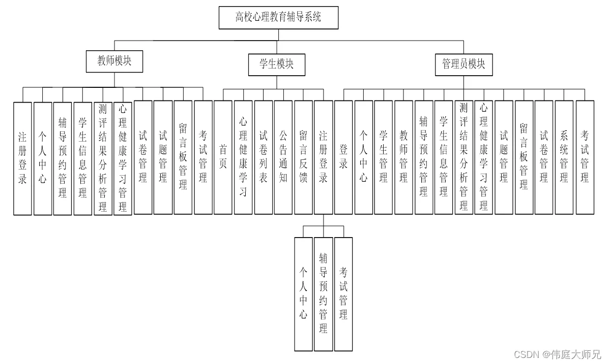 本高校心理教育辅导系统主要包括学生功能模块、教师功能模块和管理员功能模块三大部分,系统结构设计如图所示。