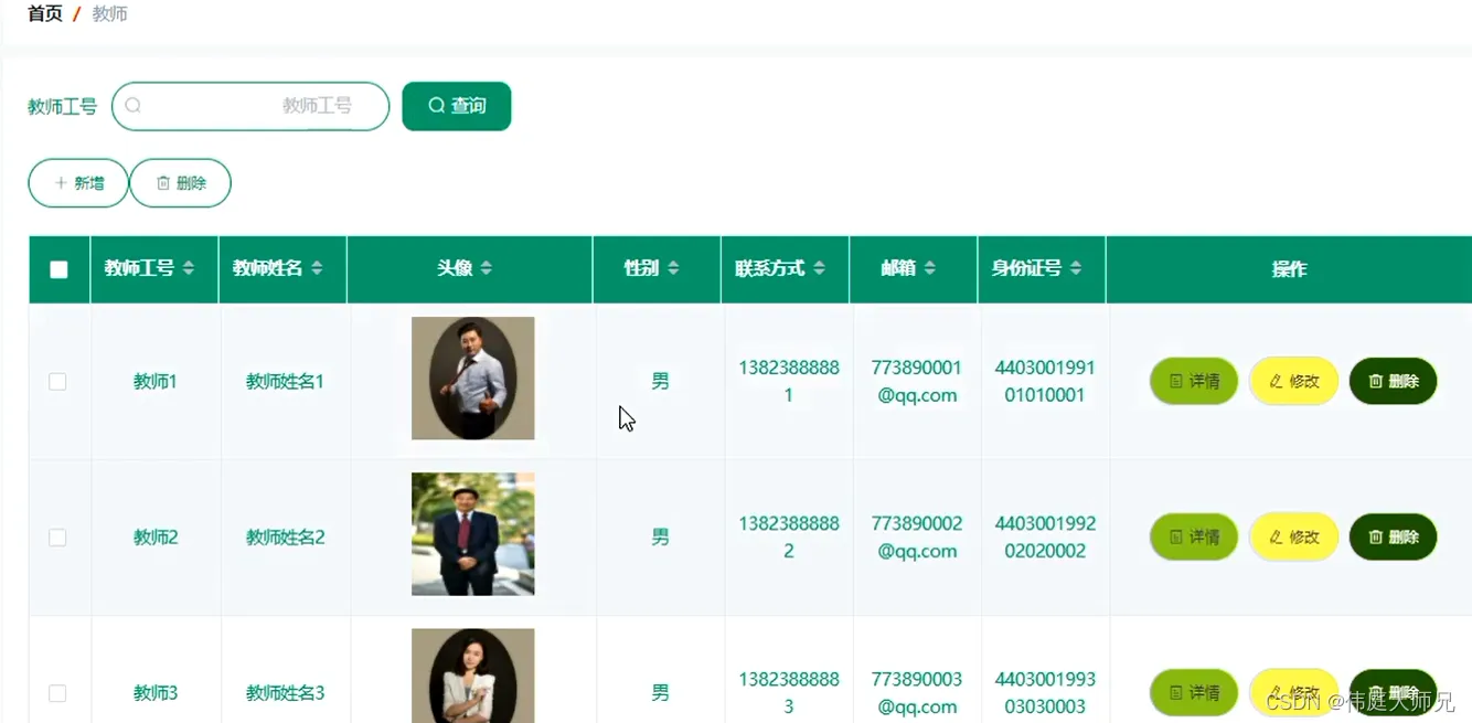 管理员可增删改查教师信息,教师管理界面展示如图5-9所示。