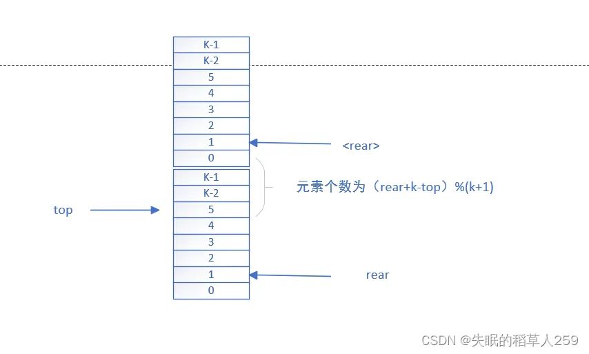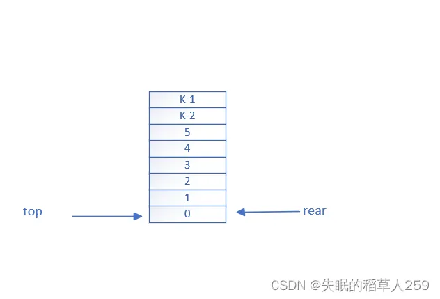由于我们多开辟了一个元素的空间,且这个空间不存放元素,也就意味着,如果已经存了k个元素,此时的rear指向这个空的区域,rear指向空间的下一个空间的元素被top指针指向。