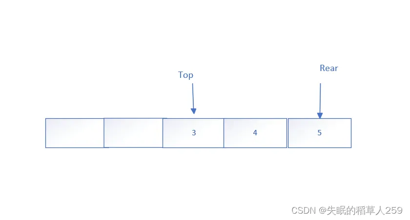 这个时候top指针向右边偏移,如果再进行入队操作我们会发现rear指针已经不能向后移动了,而此时队列并没有满(top前面还有空间)。