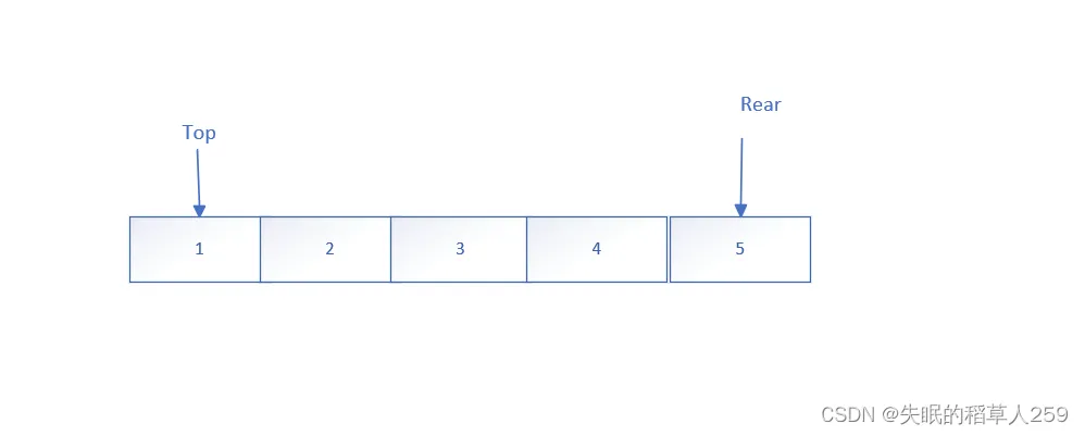 假设有以下队列,初始元素为1、2、3、4、5,队头元素是1,队尾元素是5.