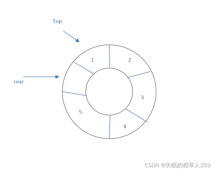 对于前面的问题,我们发现导致假溢出的主要问题就是尾指针rear不能指向可以存放空间的地址,换句话来说就是不能指向前面已经出队了元素的地址。针对这一问题,我们整个队列看成一个可以循环的环状结构,指向队头队尾的指针往后走还能回到原来的位置。
