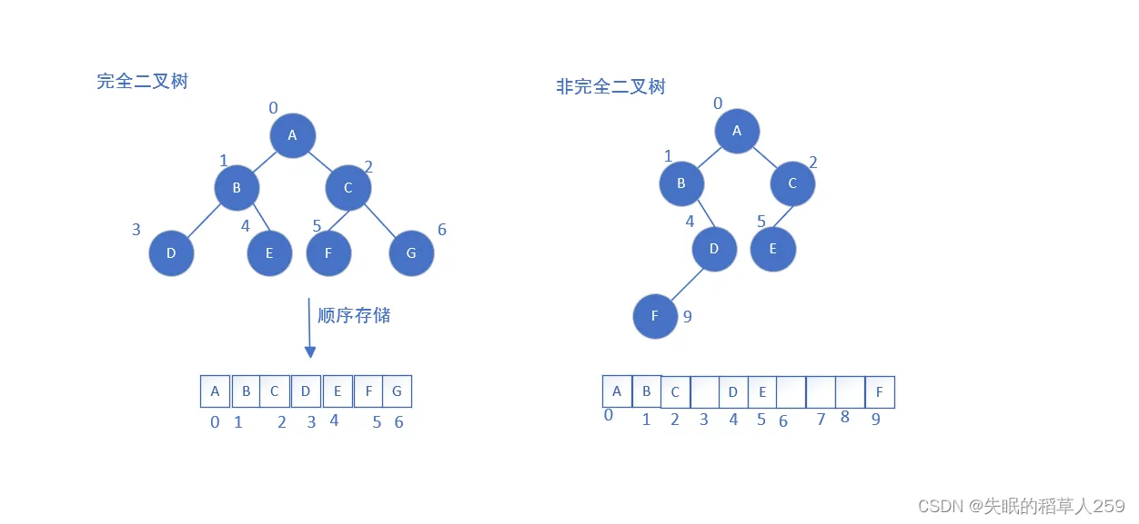 顺序结构存储就是使用数组来存储,一般使用数组只适合表示完全二叉树或者满二叉树,因为容易有空间的浪费。二叉树顺序存储在物理上是一个数组,在逻辑上是一颗二叉树。