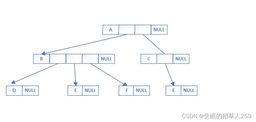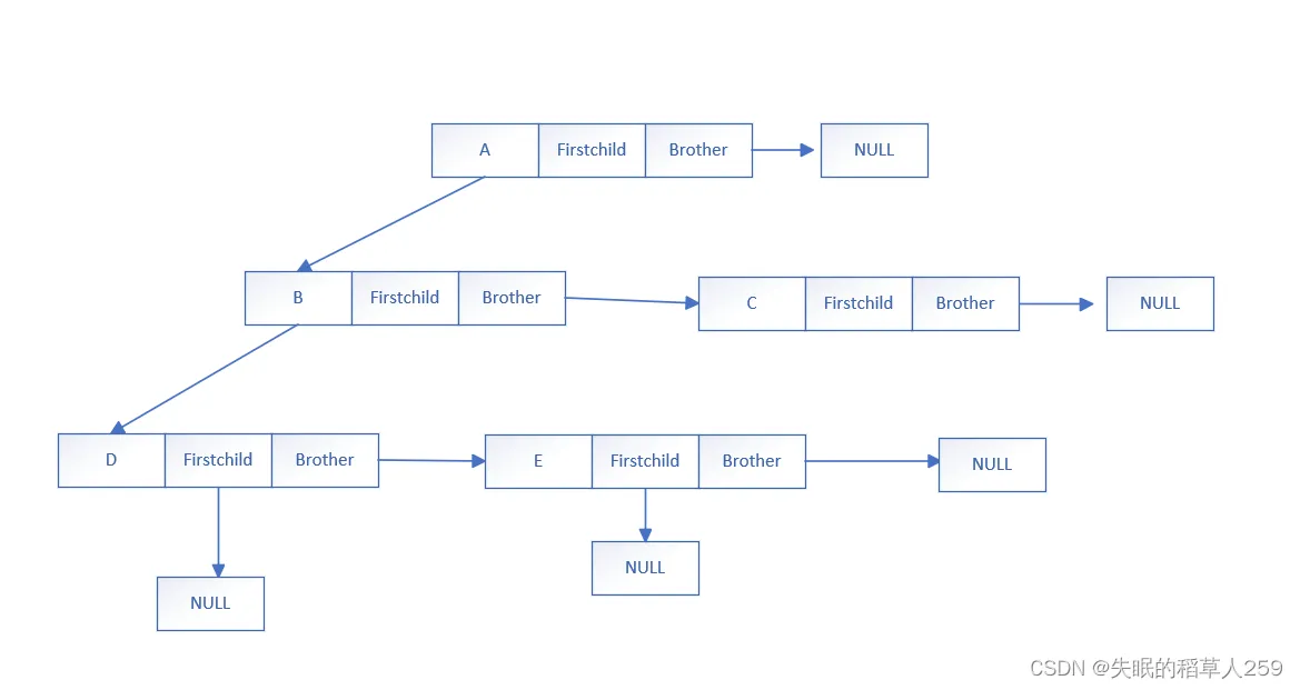 typedef int DataType; struct Node { struct Node* _firstChild1; // 第一个孩子结点 struct Node* _pNextBrother; // 指向其下一个兄弟结点 DataType _data; // 结点中的数据域 };