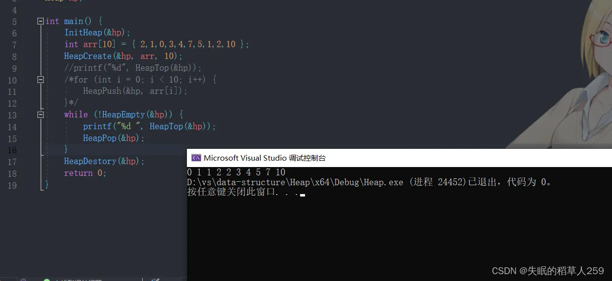 #define _CRT_SECURE_NO_WARNINGS 1 #include"Heap.h" Heap hp; int main() { InitHeap(&hp); int arr[10] = { 2,1,0,3,4,7,5,1,2,10 }; HeapCreate(&hp, arr, 10); //printf("%d", HeapTop(&hp)); /*for (int i = 0; i < 10; i++) { HeapPush(&hp, arr[i]); }*/ while (!HeapEmpty(&hp)) { printf("%d ", HeapTop(&hp)); HeapPop(&hp); } HeapDestory(&hp); return 0; }