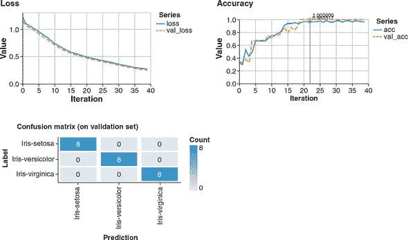 图 3.9. 40 个训练周期后鸢尾花模型的典型结果。左上方:损失函数随训练周期变化的图表。右上方:准确度随训练周期变化的图表。底部:混淆矩阵。
