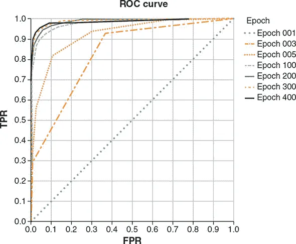 如 图 3.6 所示,在训练开始时(周期 001),由于模型的权重是随机初始化的,ROC 曲线非常接近连接点 (0, 0) 和点 (1, 1) 的对角线。这就是随机猜测的样子。随着训练的进行,ROC 曲线越来越向左上角推进——那里的 FPR 接近 0,TPR 接近 1。如果我们专注于任何一个给定的 FPR 级别,例如 0.1,我们可以看到在训练过程中,相应的 TPR 值随着训练的进展而单调递增。简而言之,这意味着随着训练的进行,如果我们将假报警率(FPR)保持不变,就可以实现越来越高的召回率(TPR)。