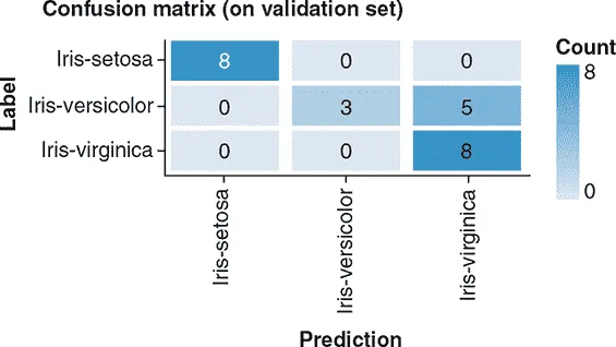 除了展示最终的混淆矩阵外,鸢尾花示例还在每个训练周期结束时使用onTrainEnd()回调绘制混淆矩阵。在早期周期中,您可能会看到一个不太完美的混淆矩阵,与图 3.9 中的混淆矩阵不同。图 3.10 中的混淆矩阵显示,24 个输入示例中有 8 个被错误分类,对应的准确率为 66.7%。然而,混淆矩阵告诉我们不仅仅是一个数字:它显示了哪些类别涉及最多的错误,哪些涉及较少。在这个特定的示例中,所有来自第二类的花都被错误分类(要么作为第一类,要么作为第三类),而来自第一类和第三类的花总是被正确分类。因此,您可以看到,在多类分类中,混淆矩阵比简单的准确率更具信息量,就像精确率和召回率一起形成了比二分类准确率更全面的衡量标准一样。混淆矩阵可以提供有助于与模型和训练过程相关的决策的信息。例如,某些类型的错误可能比混淆其他类别对更为昂贵。也许将一个体育网站误认为游戏网站不如将体育网站误认为钓鱼网站那么严重。在这些情况下,您可以调整模型的超参数以最小化最昂贵的错误。