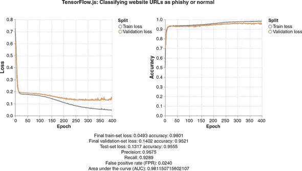 图 3.5。训练模型用于钓鱼网页检测的一轮结果示例。注意底部的各种指标:精确度、召回率和 FPR。曲线下面积(AUC)在 3.2.3 节中讨论。