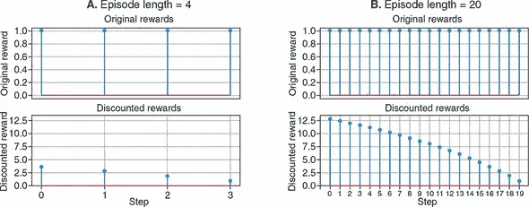 为了说明奖励折扣,我们展示了这个公式如何将原始奖励转换为更有用的价值度量方式,如 图 11.5 所示。面板 A 的顶部图显示了来自一段短情节的所有四步原始奖励。底部图显示了根据 公式 11.1 计算的折扣奖励。为了比较,面板 B 显示了来自长度为 20 的更长情节的原始和折扣总奖励。从两个面板可以看出,折扣总奖励值在开头较高,在结尾较低,这是有意义的,因为我们要为一个游戏结束的动作分配较低的值。此外,长情节的开头和中段的值(面板 B)高于短情节的开头(面板 A)。这也是有意义的,因为我们要为导致更长情节的动作分配更高的值。