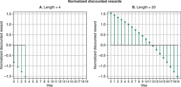 图 11.6. 对两个长度为 4(面板 A)和 20(面板 B)的情节中的折现奖励进行归一化。我们可以看到,归一化的折现奖励在长度为 20 的情节开始部分具有最高值。策略梯度方法将使用这些折现奖励值来更新策略网络的权重,这将使网络更不可能选择导致第一个情节(长度 = 4)中不良奖励的动作选择,并且更有可能选择导致第二个情节开始部分(长度 = 20)中良好奖励的选择(在相同的状态输入下,即)。