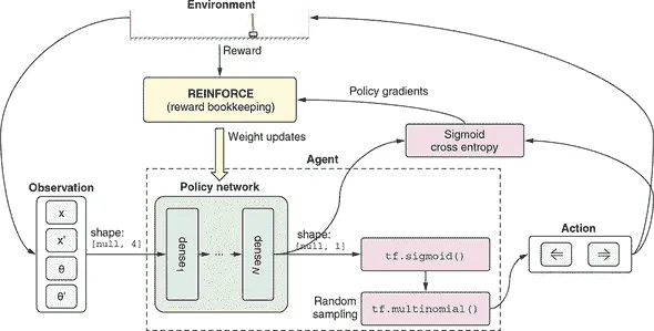 图 11.8. 展示了基于 REINFORCE 算法的解决方案对车杆问题的示意图。该图是图 11.4 中图示的扩展视图。