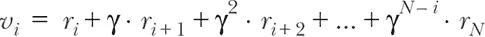 在 公式 11.1 中,v[i] 表示第 i 步状态的总折扣奖励,可以理解为该特定状态的价值。它等于在该步骤给予智能体的即时奖励 (r[i]),加上下一步奖励 (r[i][+1]) 乘以折扣系数 γ,再加上再后两步的折扣奖励,以此类推,直到该事件结束(第 N 步)。