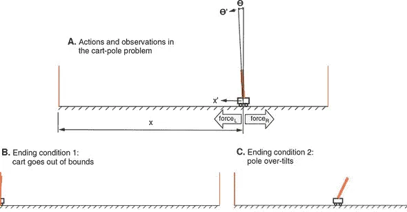 图 11.3. 小车杆问题的视觉渲染。A 面板:四个物理量(小车位置x,小车速度x′,杆倾角 θ 和杆角速度 θ’)构成环境状态和观察。在每个时间步长,代理可以选择向左施加力或向右施加力的行动,这将相应地改变环境状态。B 和 C 面板:导致游戏结束的两个条件——要么小车向左或向右移动太多(B),要么杆从垂直位置倾斜太多(C)。
